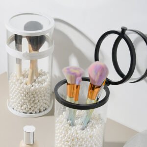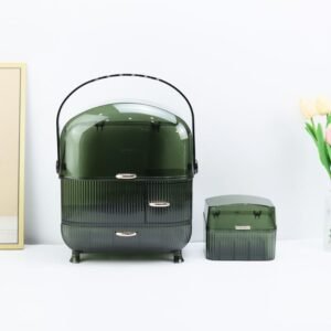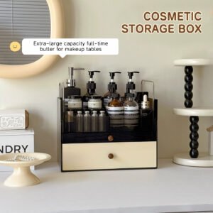 Discover the Wholesale Multi-Functional Makeup Organizer with a glass flip lid and drawer storage for lipstick, skincare, jewelry, and a multi-purpose pencil brush holder. Made of durable ABS and glass. Note: Keep away from fire.