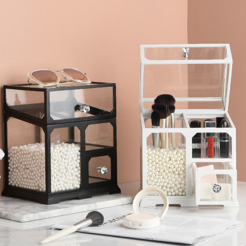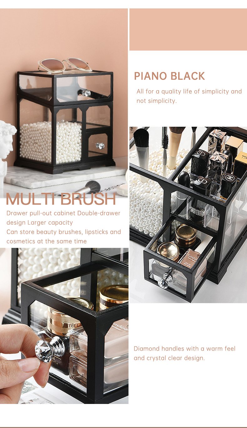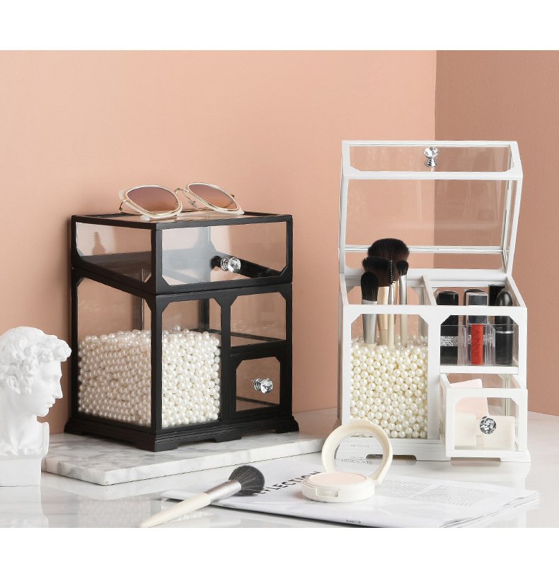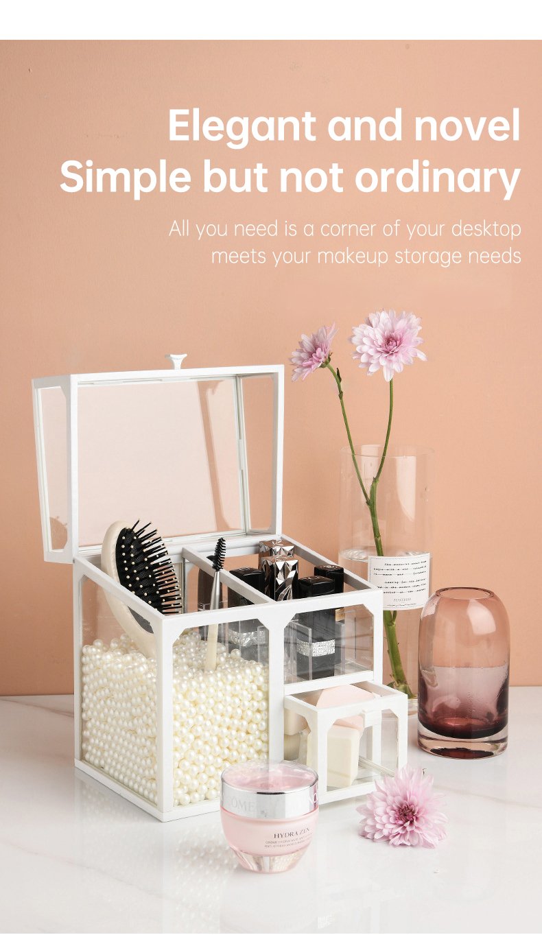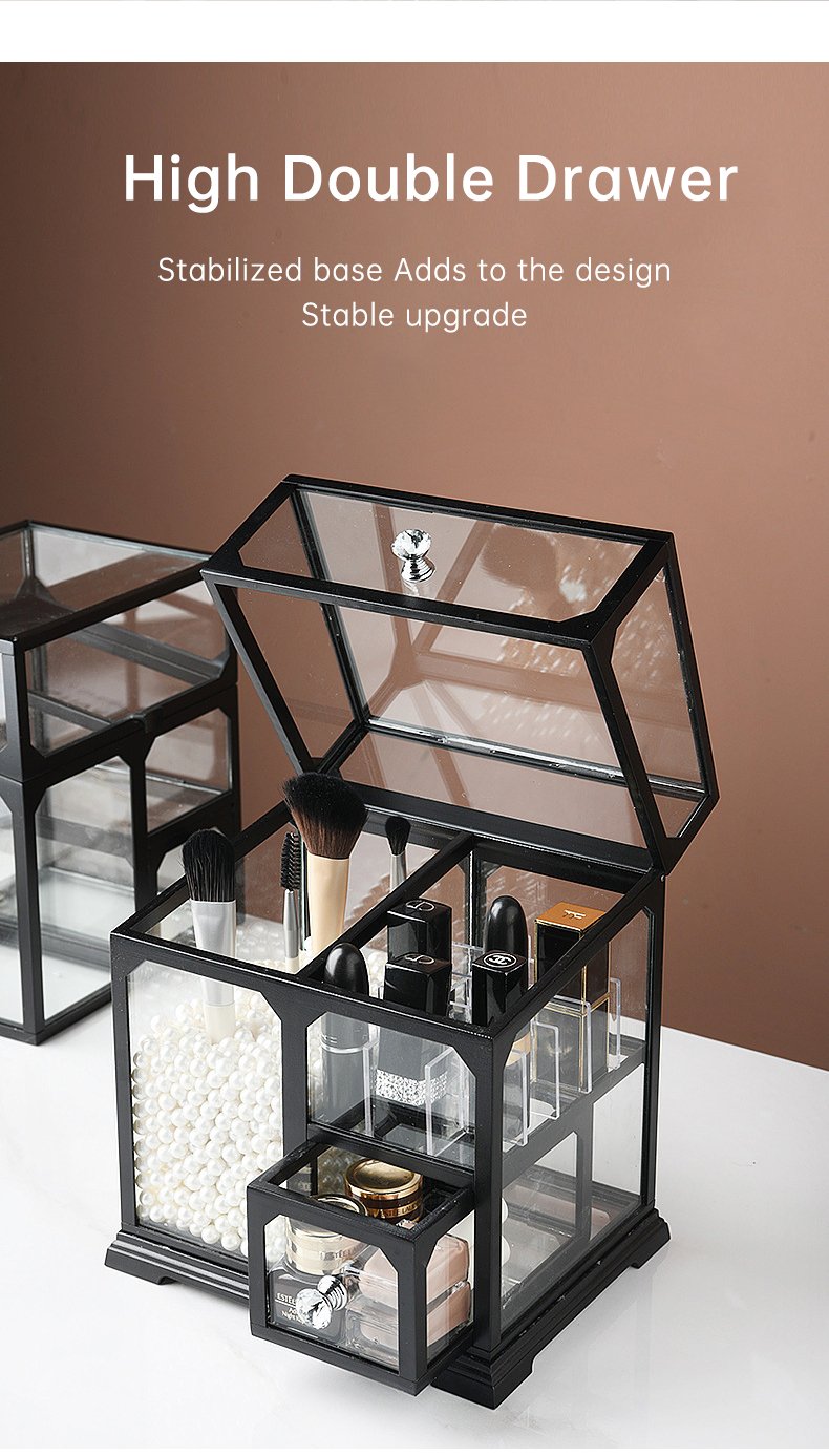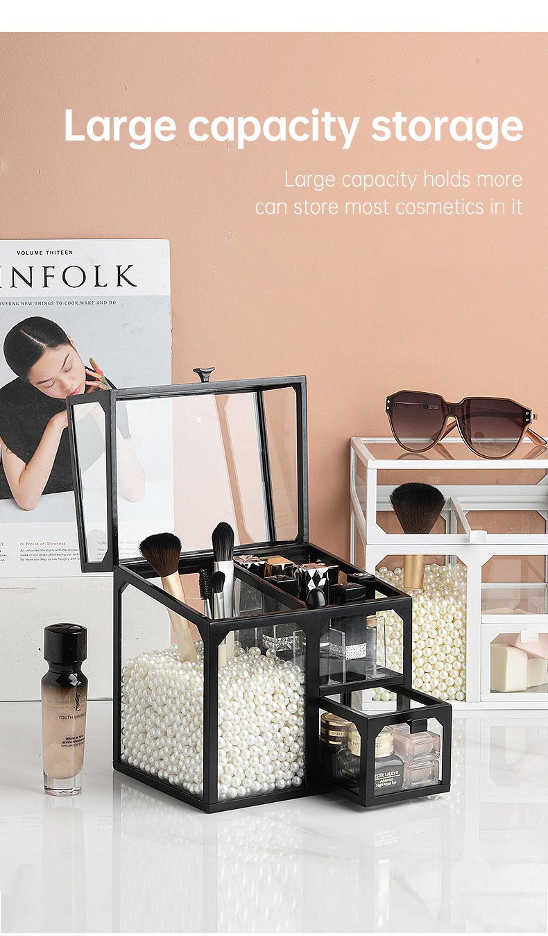 Discover the Wholesale Multi-Functional Makeup Organizer with a glass flip lid and drawer storage for lipstick, skincare, jewelry, and a multi-purpose pencil brush holder. Made of durable ABS and glass. Note: Keep away from fire.