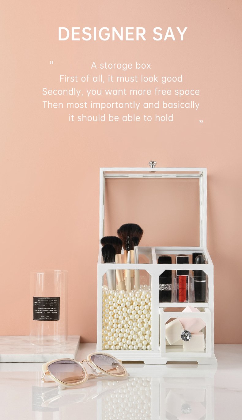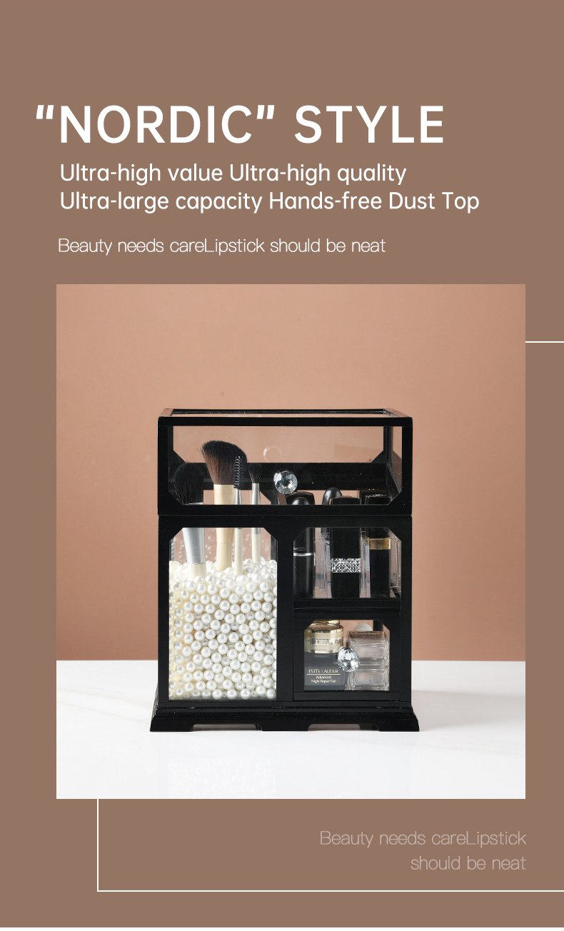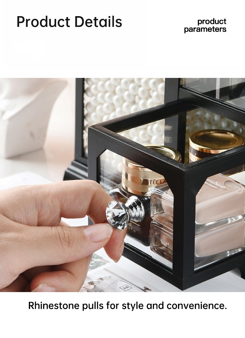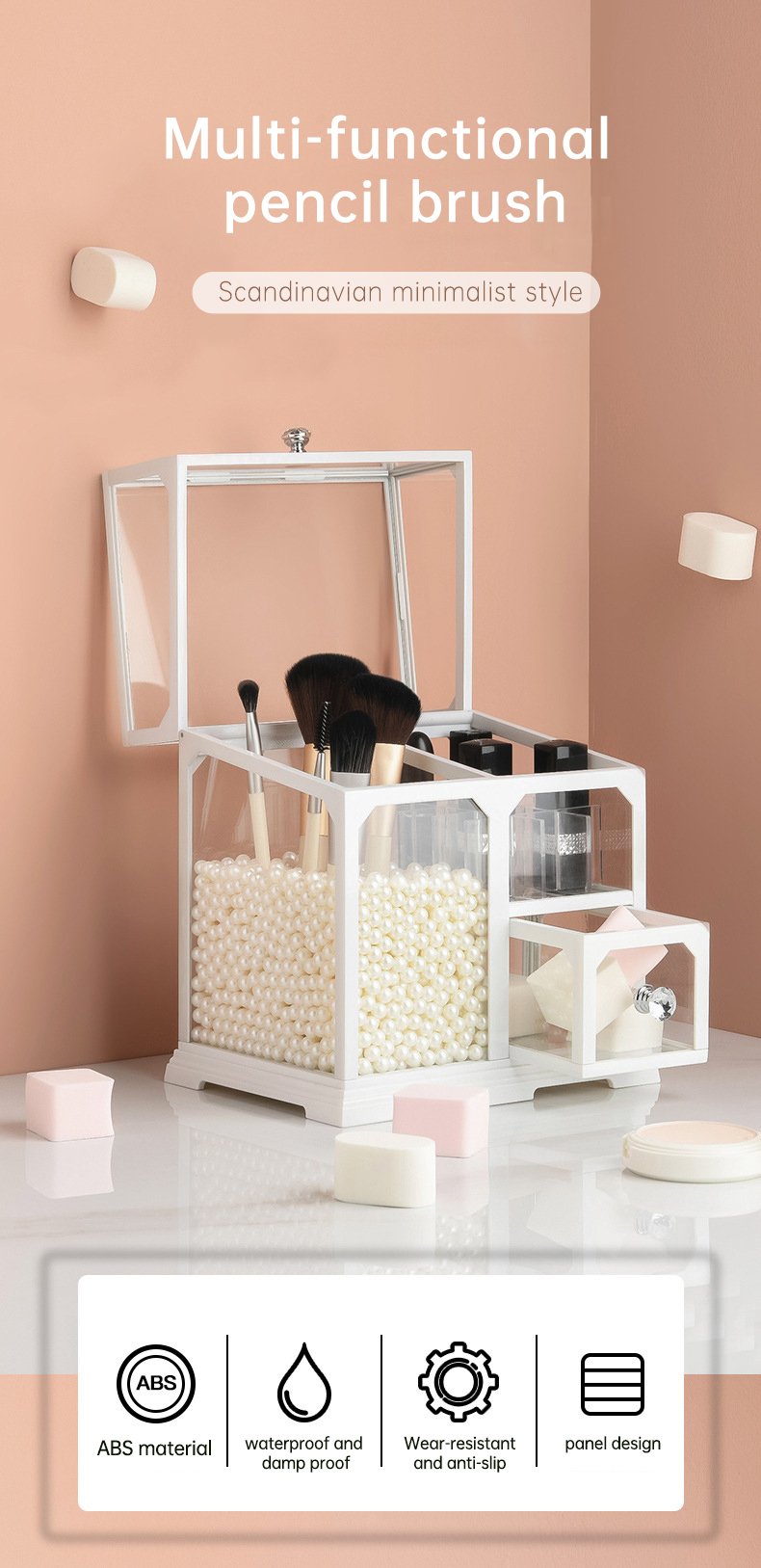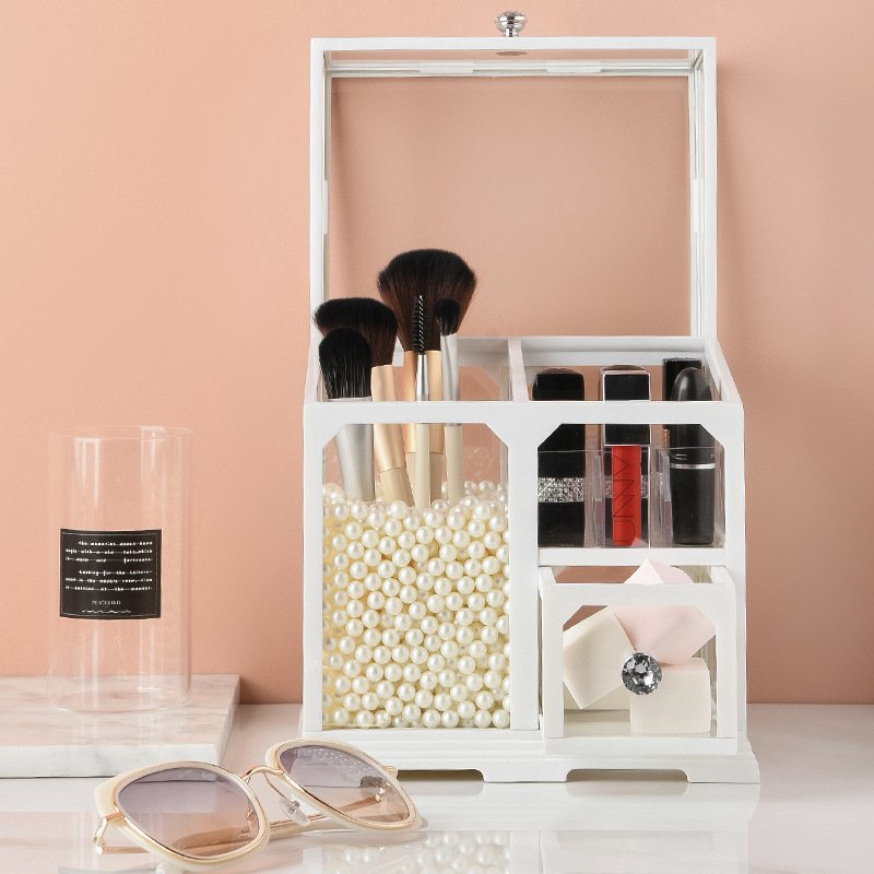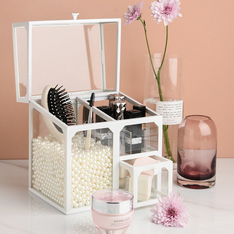 Discover the Wholesale Multi-Functional Makeup Organizer with a glass flip lid and drawer storage for lipstick, skincare, jewelry, and a multi-purpose pencil brush holder. Made of durable ABS and glass. Note: Keep away from fire.